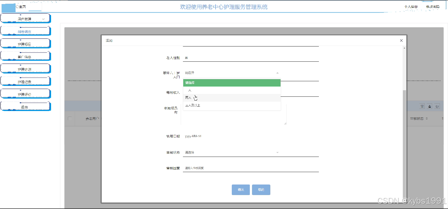 养老用户点击“问卷调查”按钮根据系统提示填写问卷调查内容,包括每月收入、家庭成员、填写日期等信息后点击提交按钮,问卷调查提交之后由管理员进行审核。
