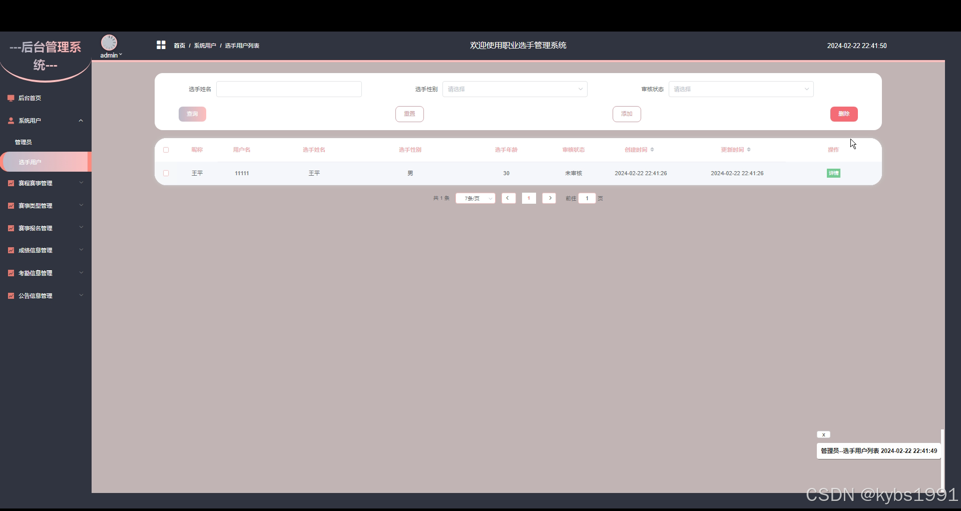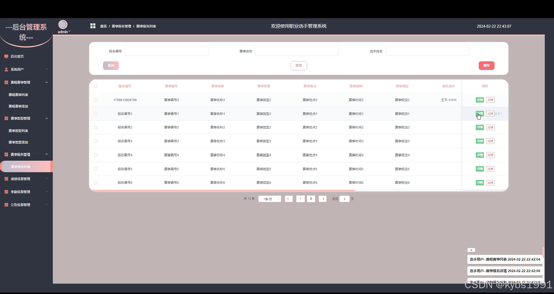 赛事报名管理:管理员可以管理赛事的报名情况,包括审核选手的报名申请、查看报名信息和处理相关事务。界面如下图所示。