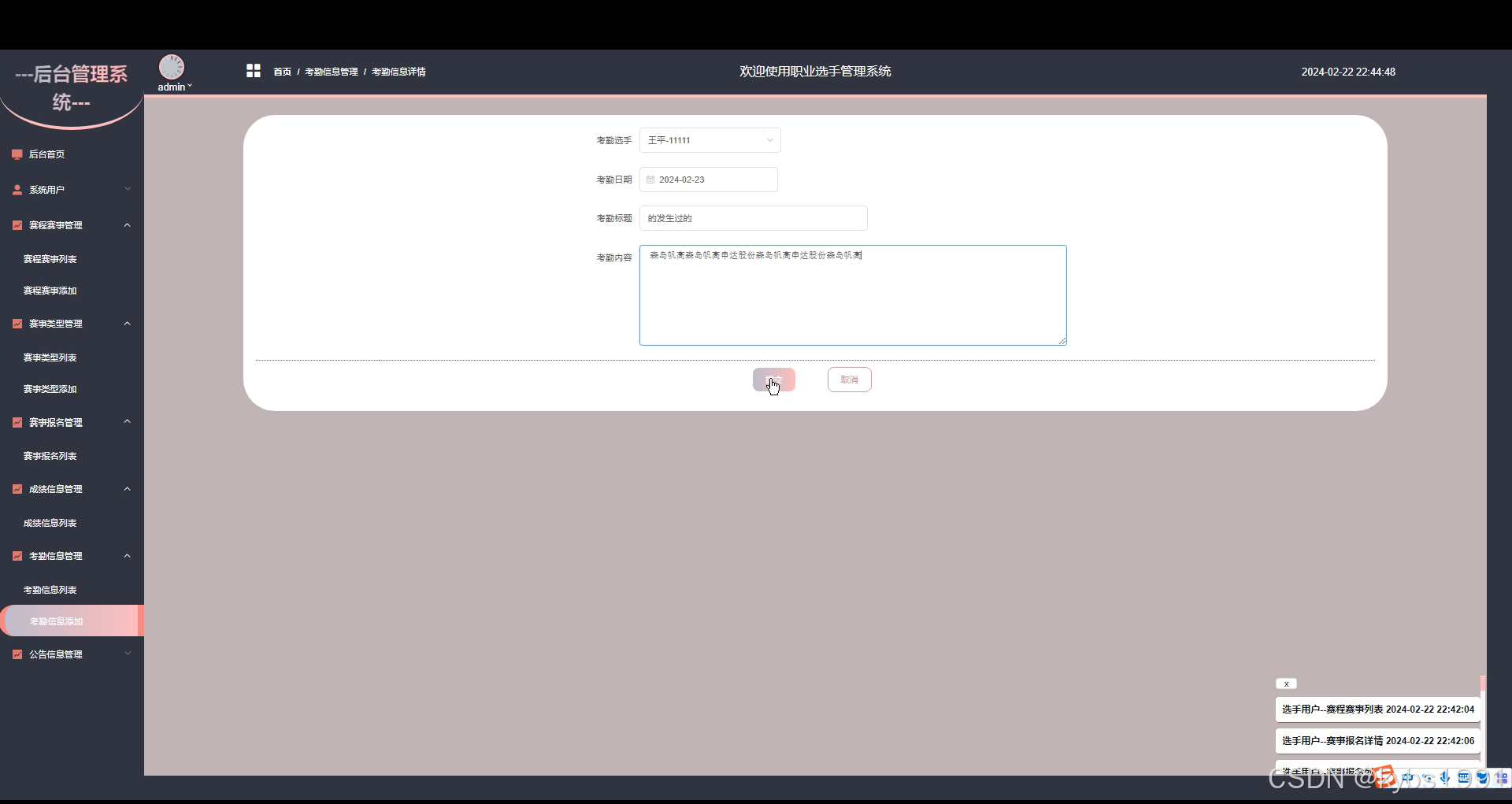 考勤信息管理:管理员可以记录和管理选手的考勤信息,包括考勤选手、日期、标题、内容等,用于统计和记录选手参与比赛的情况。界面如下图所示。