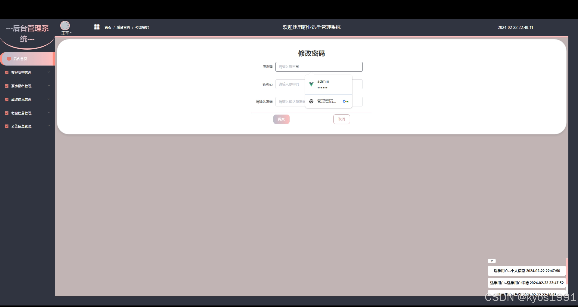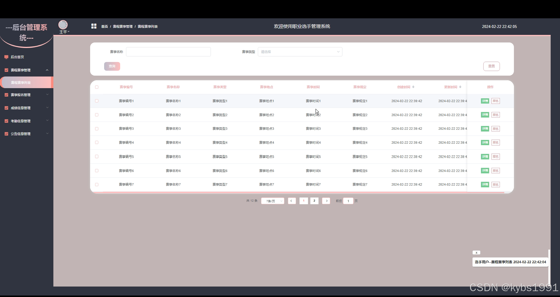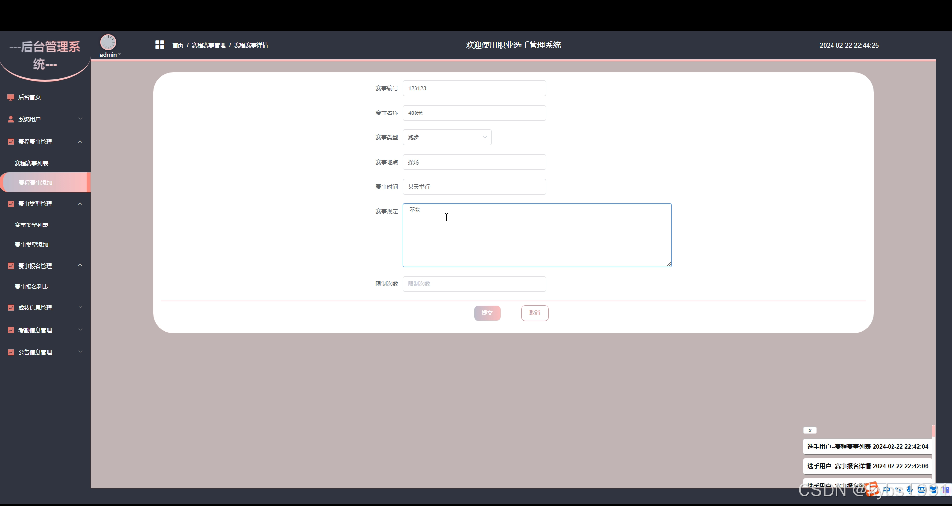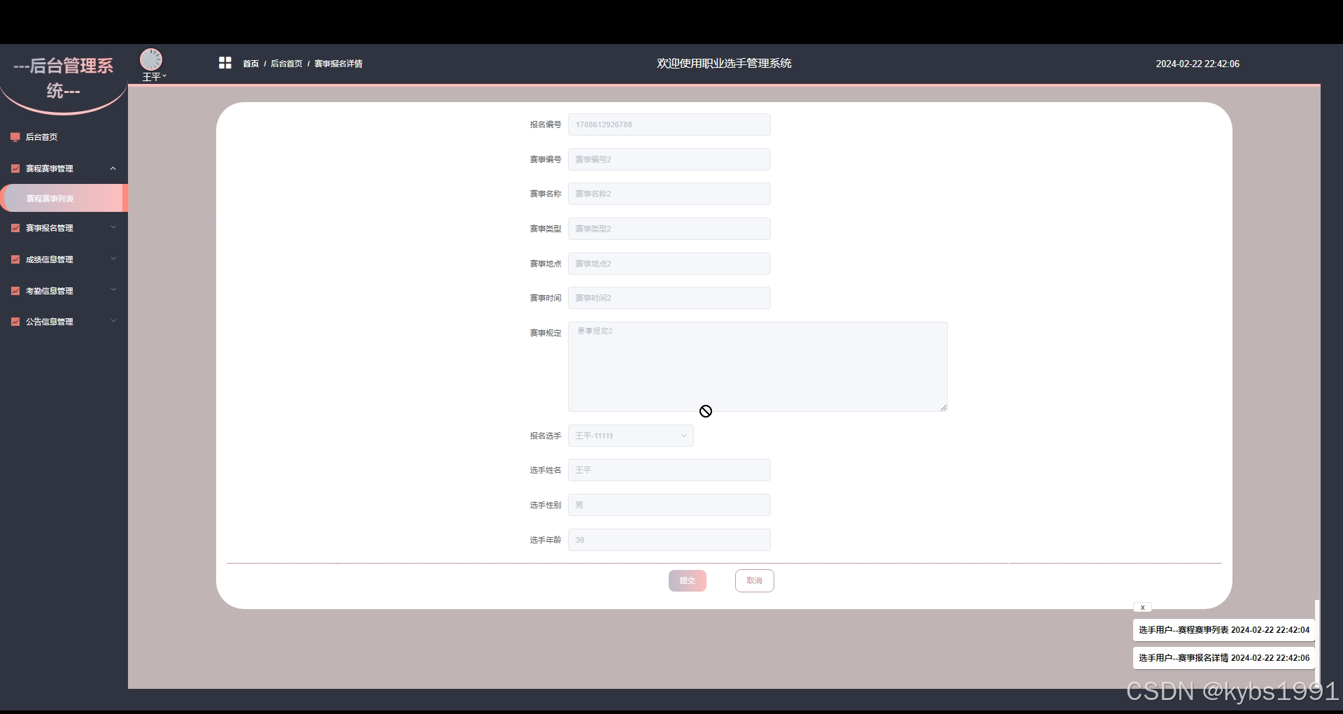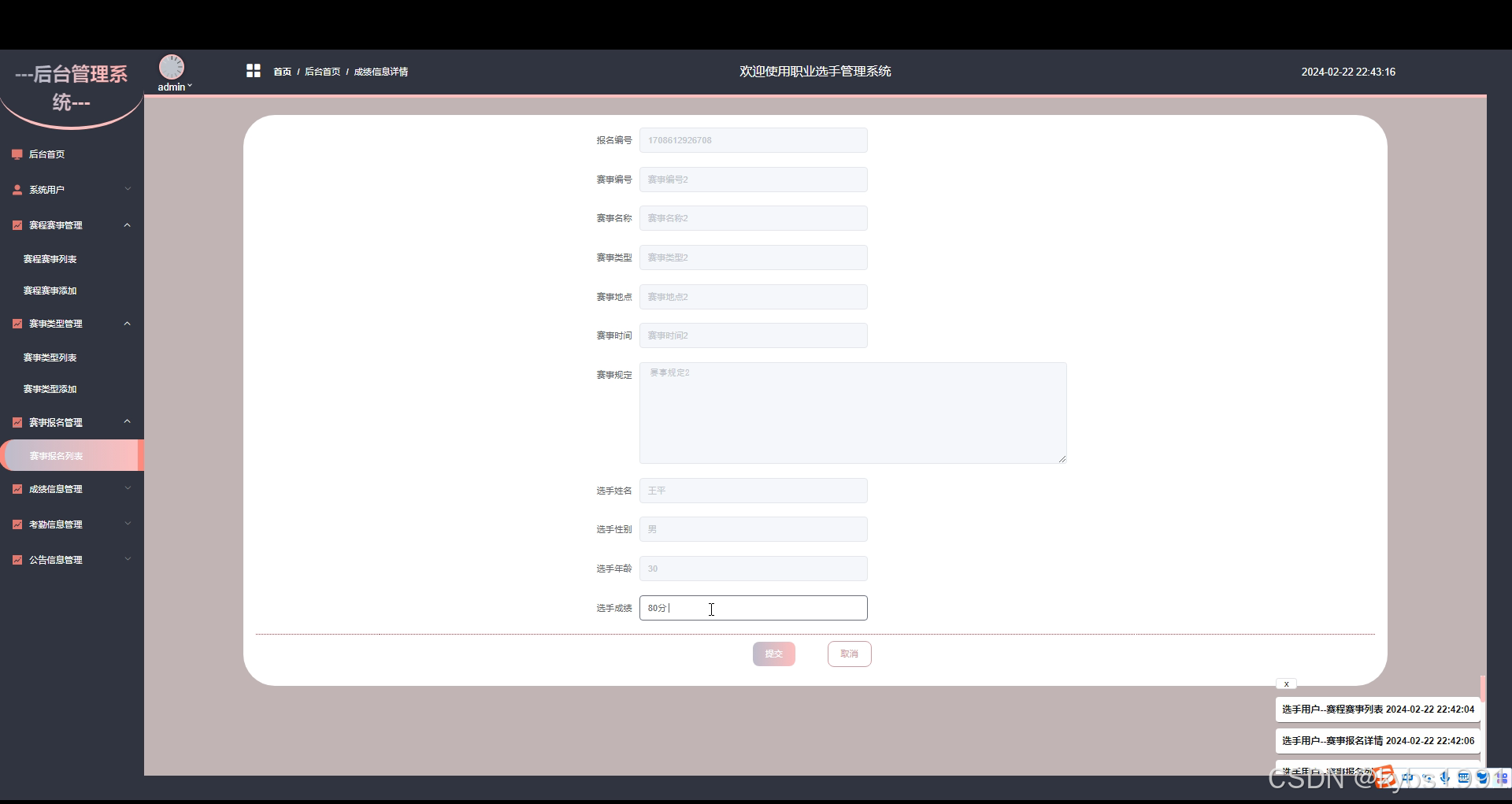 - 后台首页:选手用户可以查看系统的整体概况,包括最新公告、赛程赛事等重要信息,以便快速了解个人相关事务。