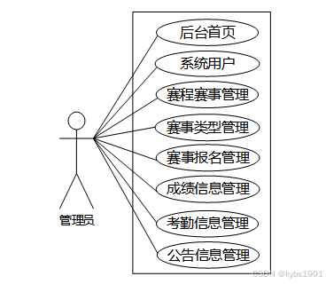 职业选手管理系统中管理员角色功能包含了后台首页、系统用户(管理员、系统用户)、赛程赛事管理、赛事类型管理、赛事报名管理、成绩信息管理、考勤信息管理、公告信息管理等功能,管理员的用例图如图2.2所示: