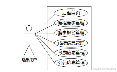 职业选手管理系统选手用户包括后台首页、赛程赛事管理、赛事报名管理、成绩信息管理、考勤信息管理、公告信息管理等功能,用例图如图2.1所示:
