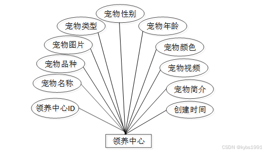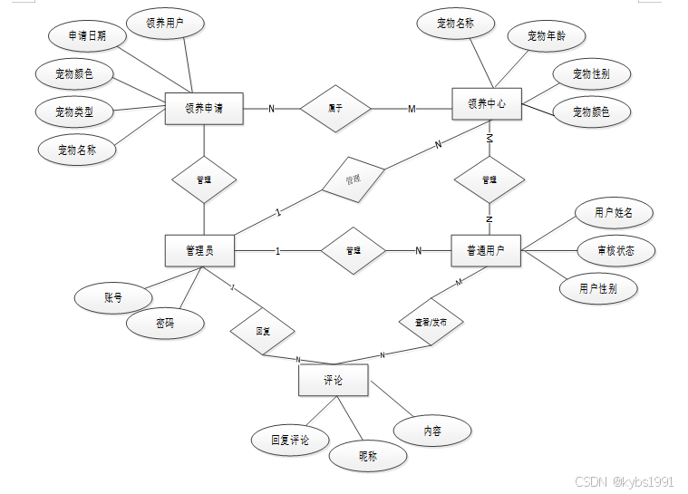 在需求分析中,我们用来分析的对象往往是抽象的概念,所以在这个环节应当避免过于细致的细节分析,而是通过这些抽象的概念来分析实体所具备的属性和实体之间的联系。宠物领养管理系统利用E-R图对上述实体和联系进行描述。