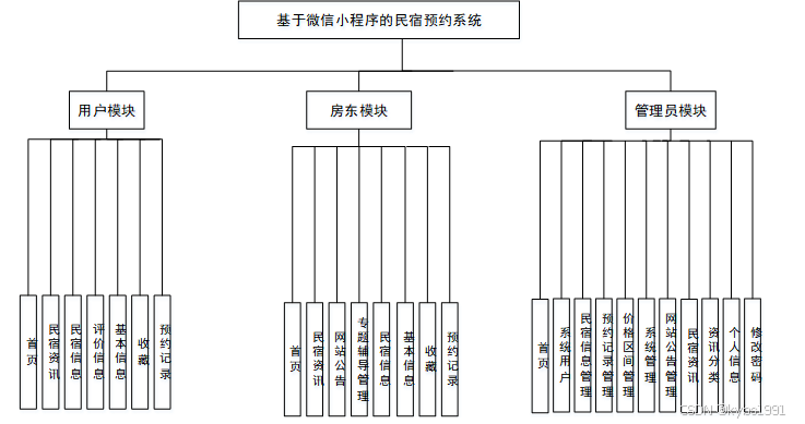 基于微信小程序的民宿预约系统我划分为了普通用户管理模块,房东用户管理模块和管理员模块这三大部分。