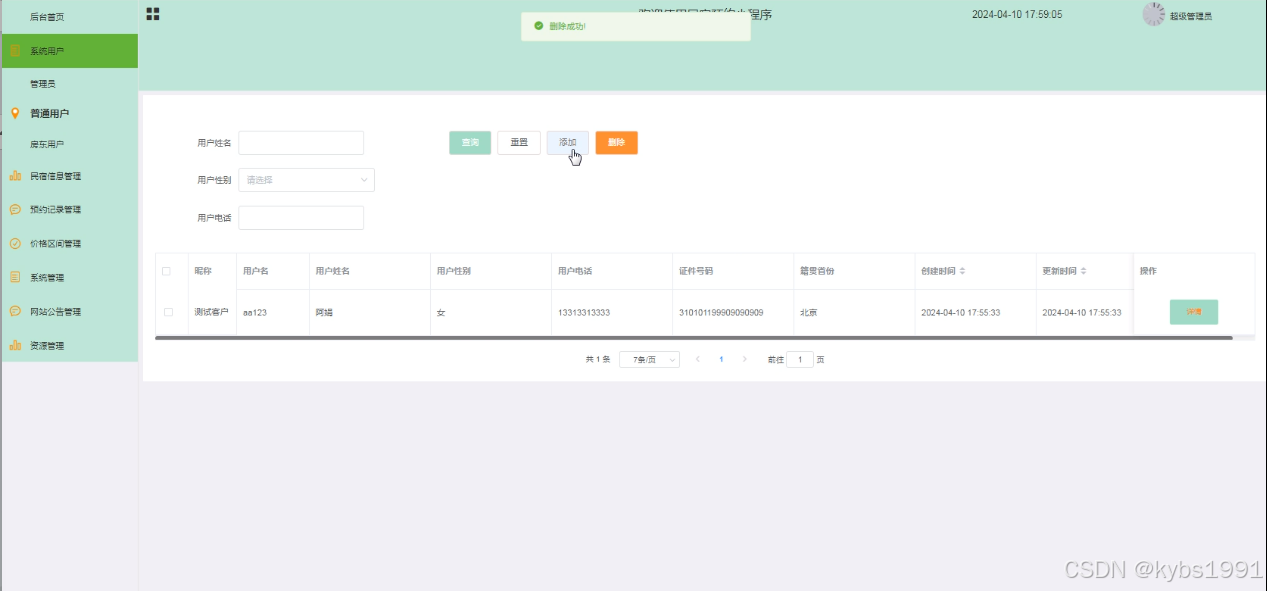 (5)系统用户管理:管理员可以对系统中所有的用户角色进行管控,包含了管理员、普通用户、房东用户等角色,如果需要添加新的用户,点击页面中的“添加”按钮根据提示输入上用户信息,点击“提交”以后在对应的用户界面就可以查看到了,可以点击用户后面的“删除”按钮直接删除某一用户。