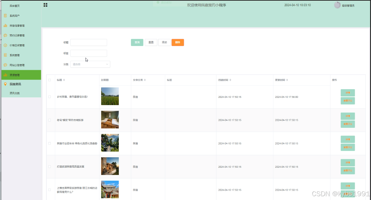 进入后台首页工具栏点击“资源管理”这个按钮可以查看所有民宿资讯、资讯分类等信息,可以进行详情查看、删除、查看评论等操作。界面如下图4-10所示。