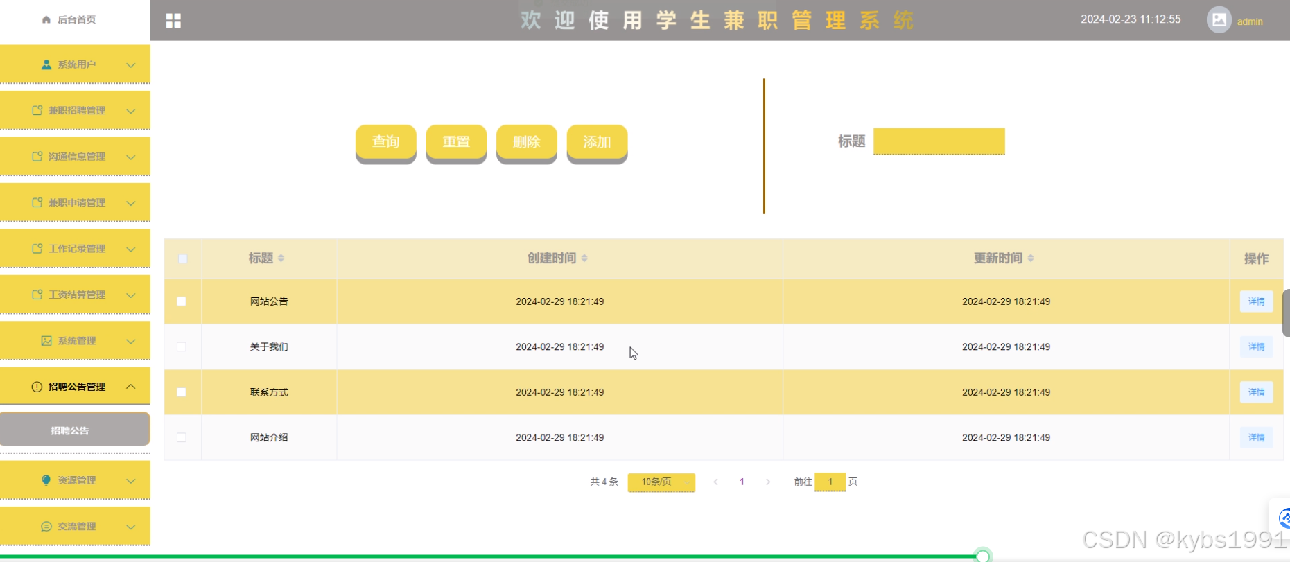 资源管理: 包括招聘资讯和资讯分类的管理,管理员可以添加、编辑和删除招聘相关的资讯,并对资讯进行分类管理。