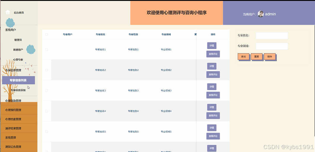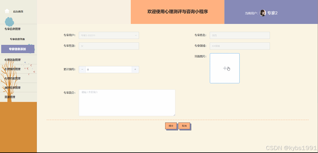 专家信息管理: 管理心理专家的信息,包括添加、编辑和删除专家信息。