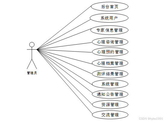 管理员角色的用例包括后台首页、系统用户、专家信息管理、心理咨询管理、心理预约管理、心理档案管理、测评结果管理、系统管理(轮播图管理、敏感词管理)、通知公告管理、资源管理(心理资讯、资讯分类、心理测评)、交流管理(交流论坛、论坛分类)。