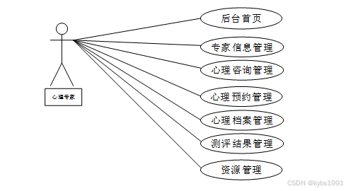 心理专家角色的用例包括后台首页、专家信息管理、心理咨询管理、心理预约管理、心理档案管理、测评结果管理、资源管理(心理测评)。