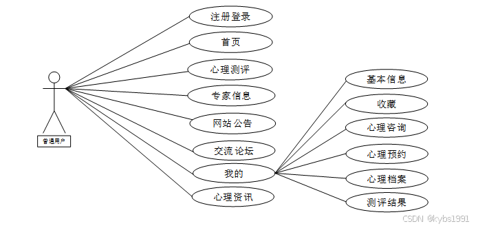普通用户角色的用例包括登录注册、首页、心理测评、专家信息、网站公告、交流论坛、心理资讯、我的(基本信息、收藏、心理咨询、心理预约、心理档案、测评结果)。
