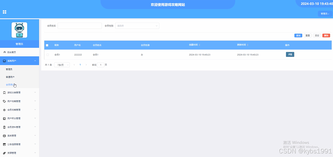 基于springboot的游戏攻略网站中的管理人员是可以对注册的普通用户、会员用户进行管理的,也可以对管理员进行管控。界面如下图4-7所示。