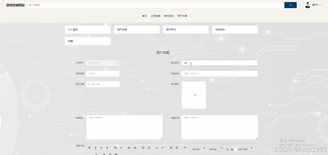 普通用户还可个人中心页面点击“用户攻略”,可以发布自己的游戏攻略和心得。界面如下图所示。