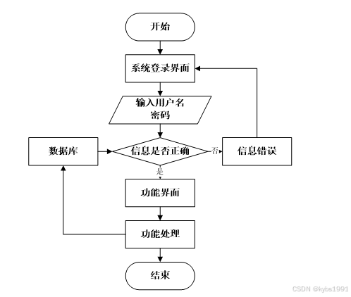 用户打开并进入系统后,会先显示登录界面,输入正确的用户名和密码,系统自动检测信息,若信息无误,则用户会进入系统功能界面,进行操作,否则会提示错误无法登录,操作流程如图2-3所示。