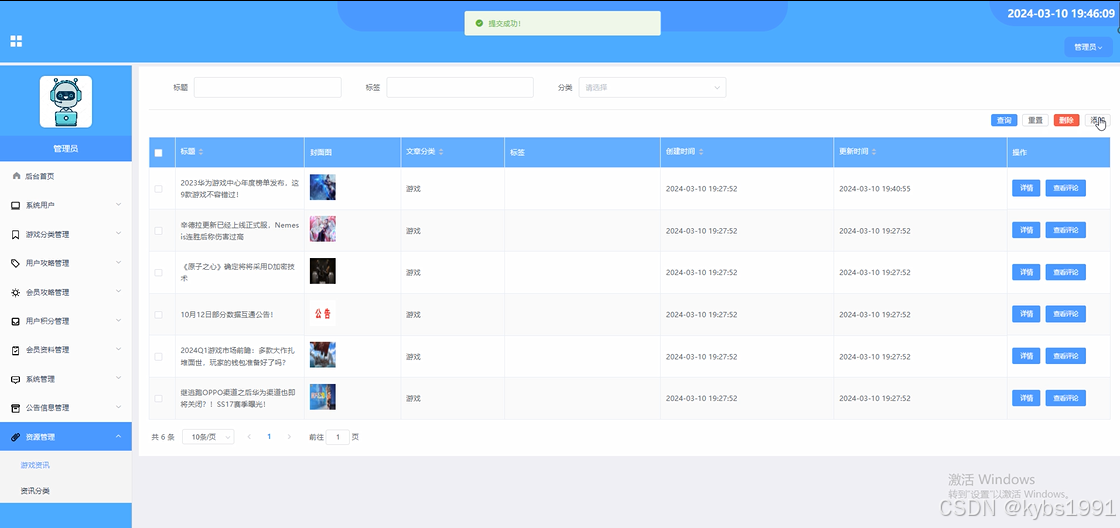 当管理员点击“资源管理”这一菜单的时候,会出现游戏资讯+资讯分类这两个子菜单,可以对这两个模块进行增删改查操作。资源管理界面如下图所示。
