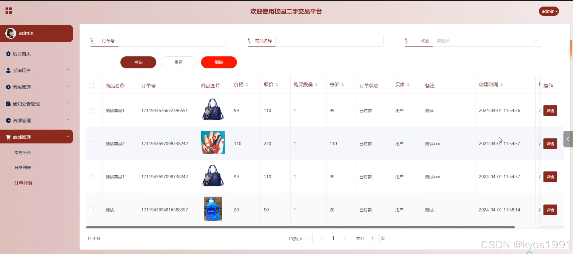 - 商城管理:在商城管理菜单包括交易平台和订单列表这两个子菜单,用户可以对交易平台信息进行增删改查操作可以查询、重置和删除订单列表信息。