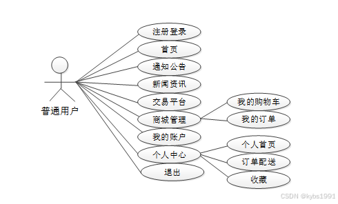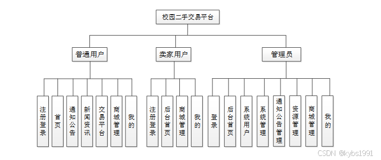 按照校园二手交易平台的角色,主要包括普通用户、卖家用户和管理员这三大功能模块,各模块功能如下。