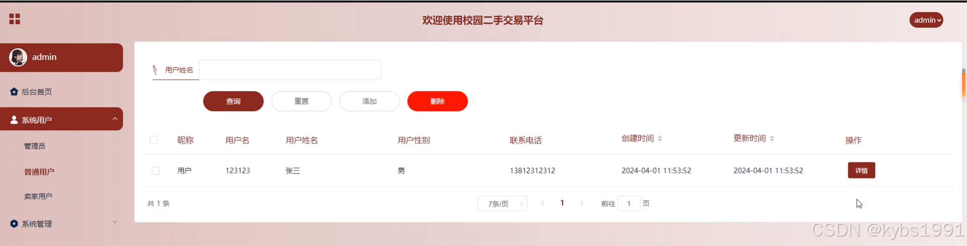 - 系统用户:管理员可以查看系统用户(管理员、普通用户、卖家用户)列表中某一用户的详情,可以对系统用户信息进行增删改查操作。
