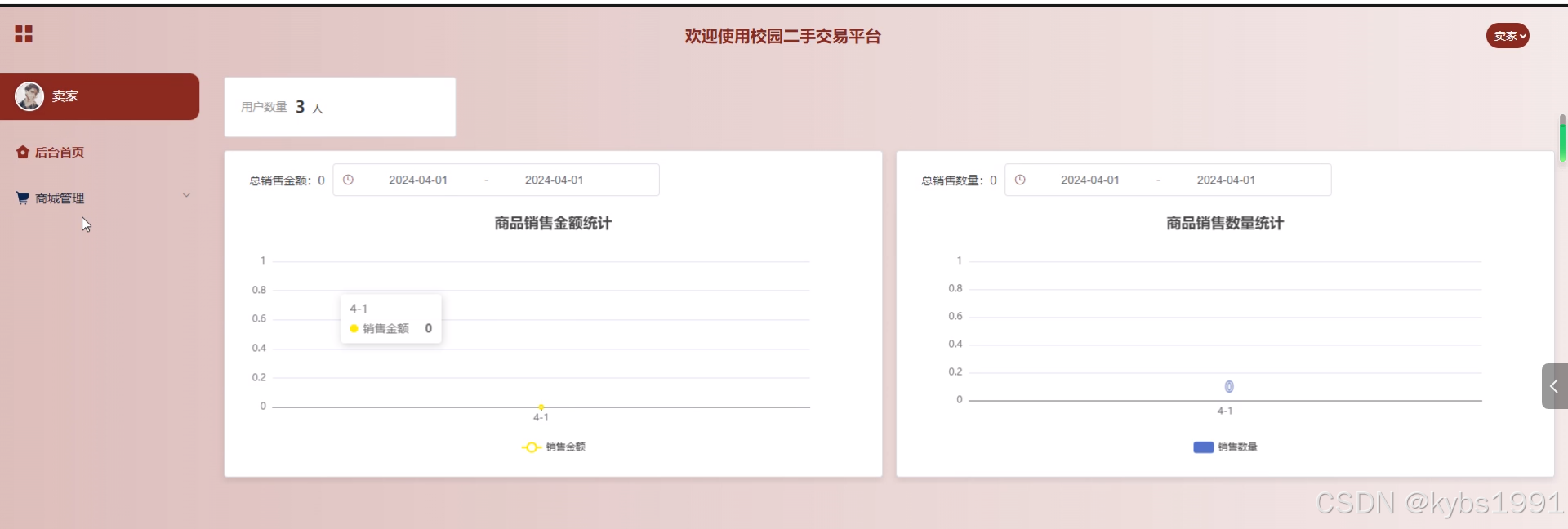 - 后台首页:用户可以查看后台首页展示的商品销售金额和商品销售数量统计图信息。
