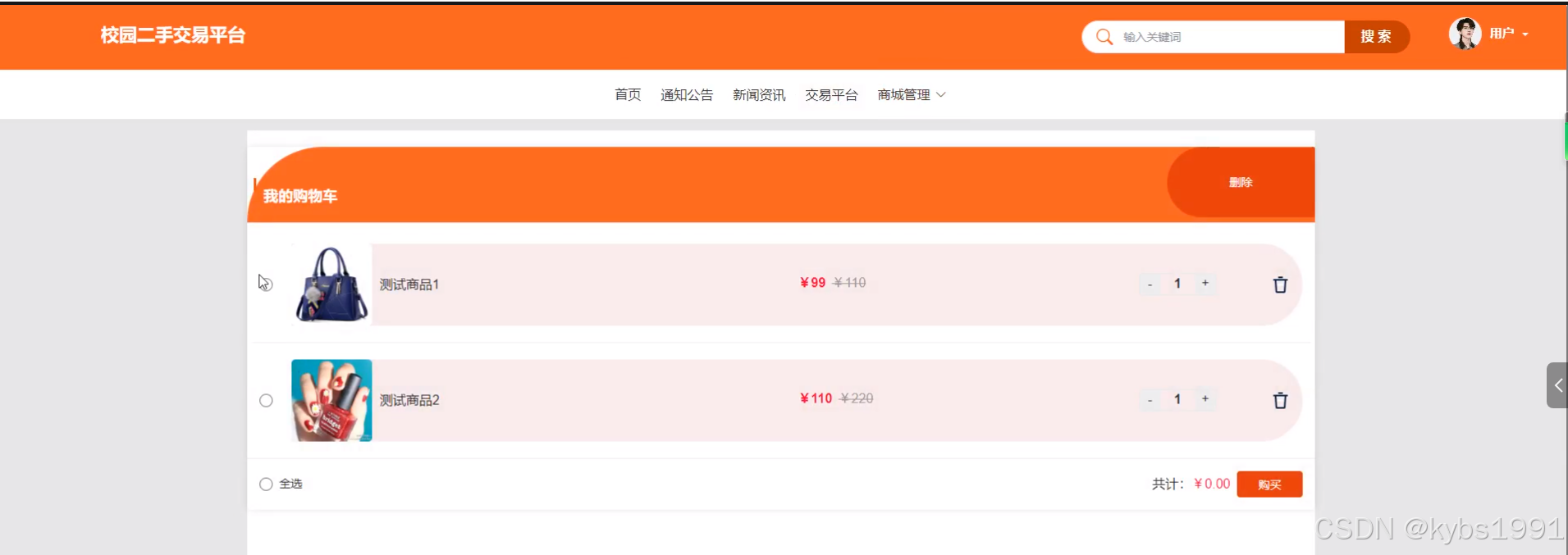 - 商城管理:用户可以对购物车的商品数量进行增减,可以完成商品购买或者删商品信息;可以查看或删除我的订单信息。