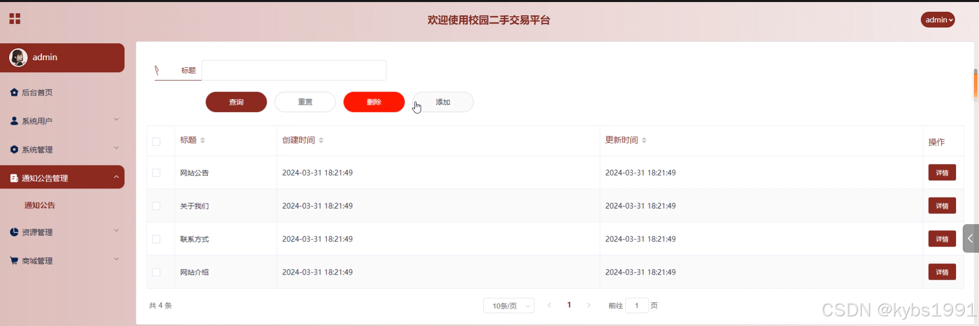- 通知公告管理:通知公告管理界面是管理员用来管理系统中的通知公告的界面,管理员可以对通知公告进行增删改查操作。