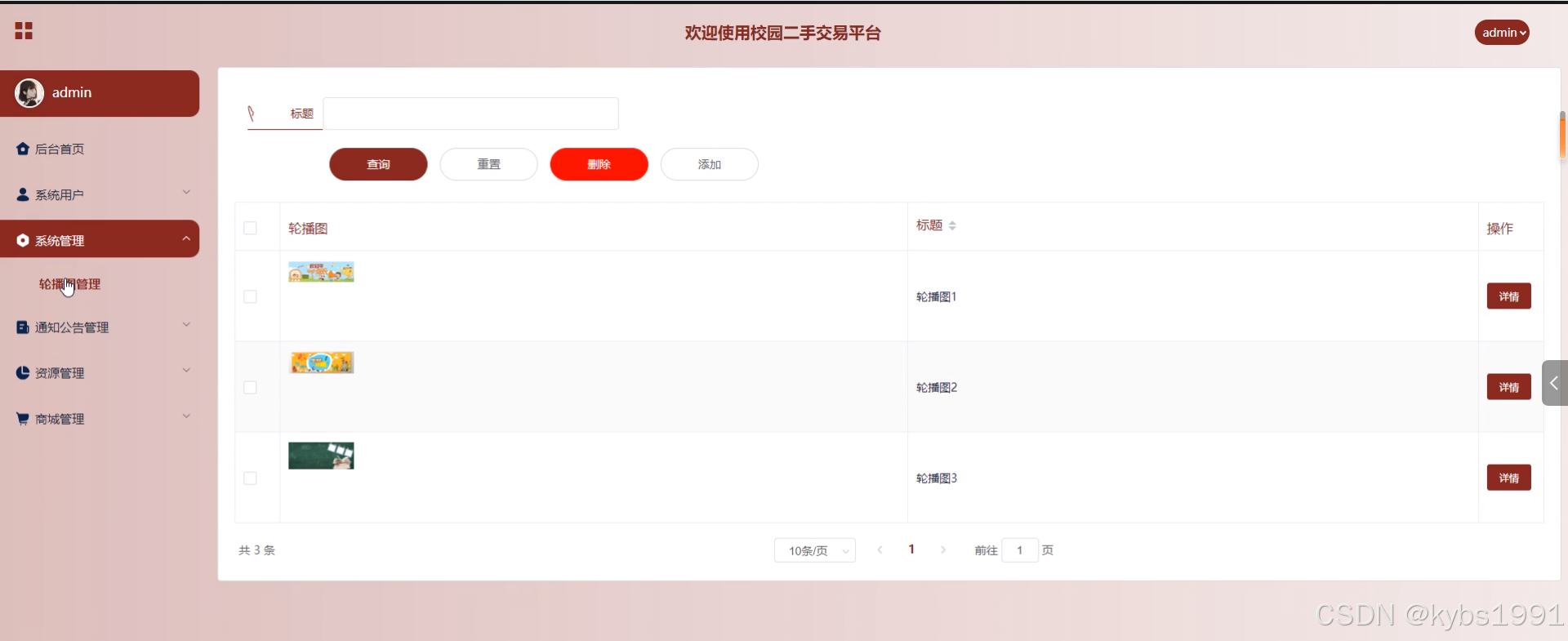 - 系统管理:管理员在“系统管理”这一菜单下对轮播图进行管控,可以对轮播图信息进行增删改查操作。