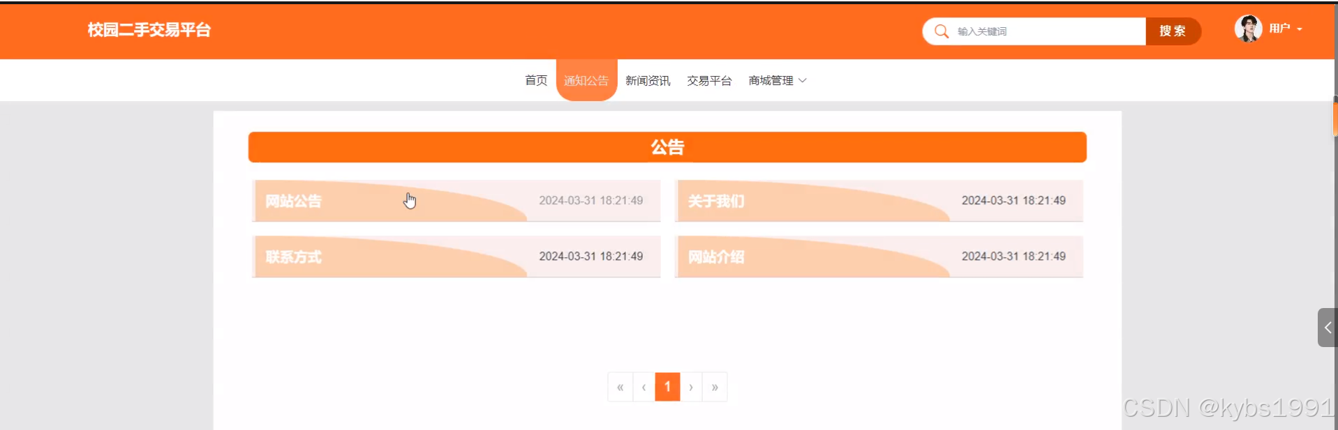 - 通知公告:用户可以查看系统发布的网站公告、关于我们、联系方式、网站介绍等信息。