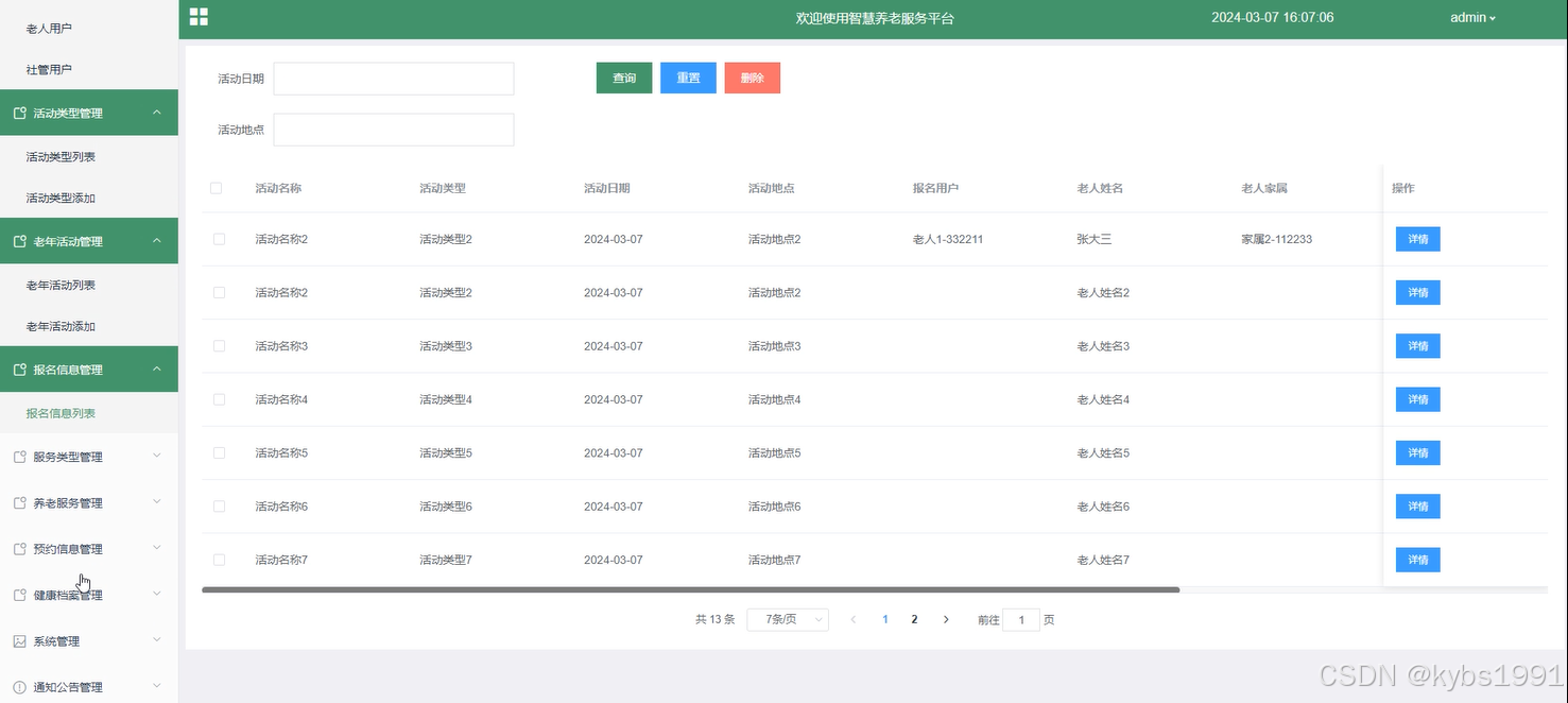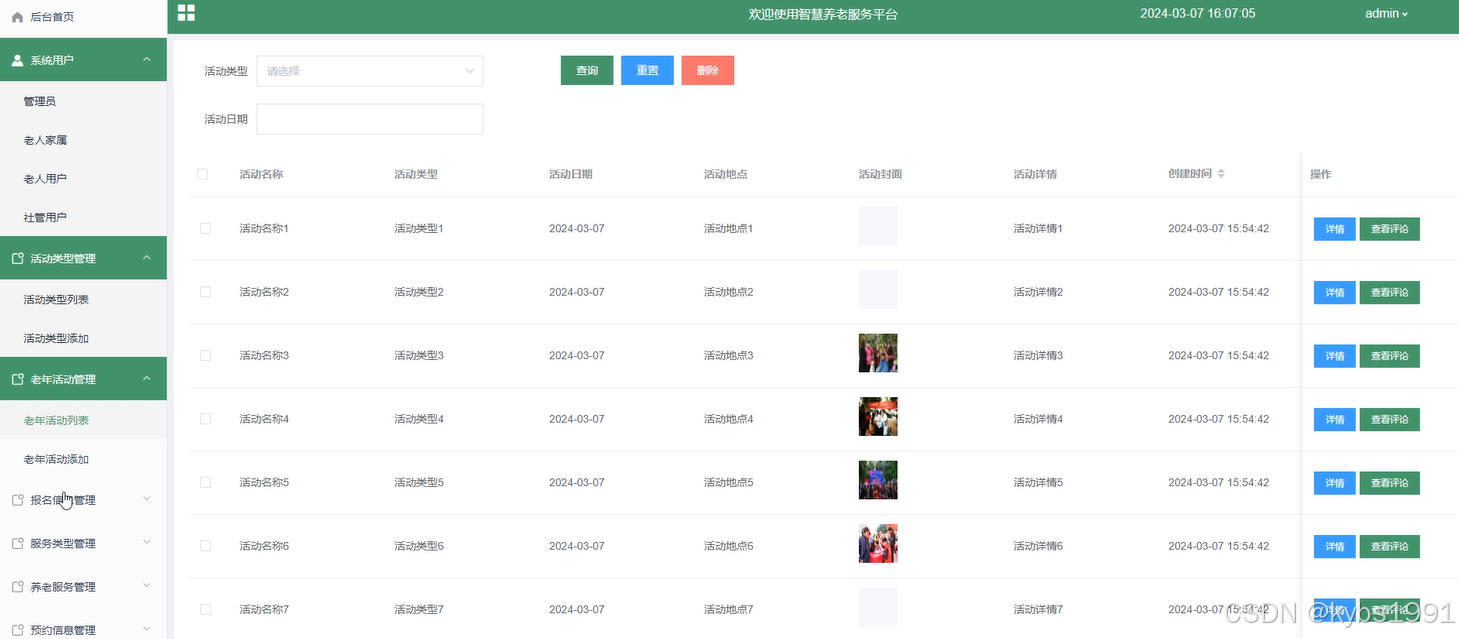 (8)老年活动:管理员点击“老年活动”会显示出所有的老年活动信息,支持通过活动名称或者活动类型对老年活动信息进行查询,如果想要添加新的老年活动信息,点击“添加”按钮,输入相关信息,点击“提交”按钮就可以添加了,同时可以选择某一条健老年活动信息,点击“删除”进行删除,也可以对用户提交的老年活动评论的信息进行管控。