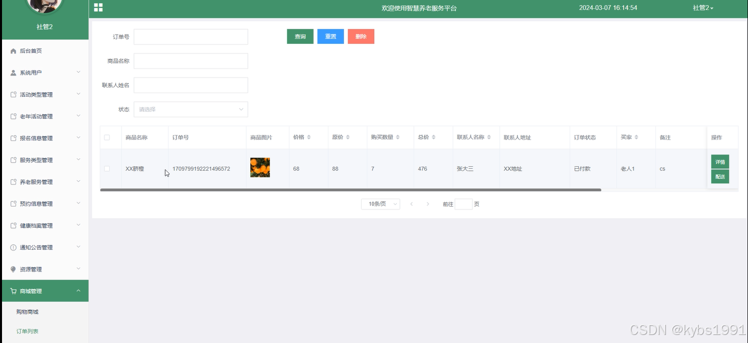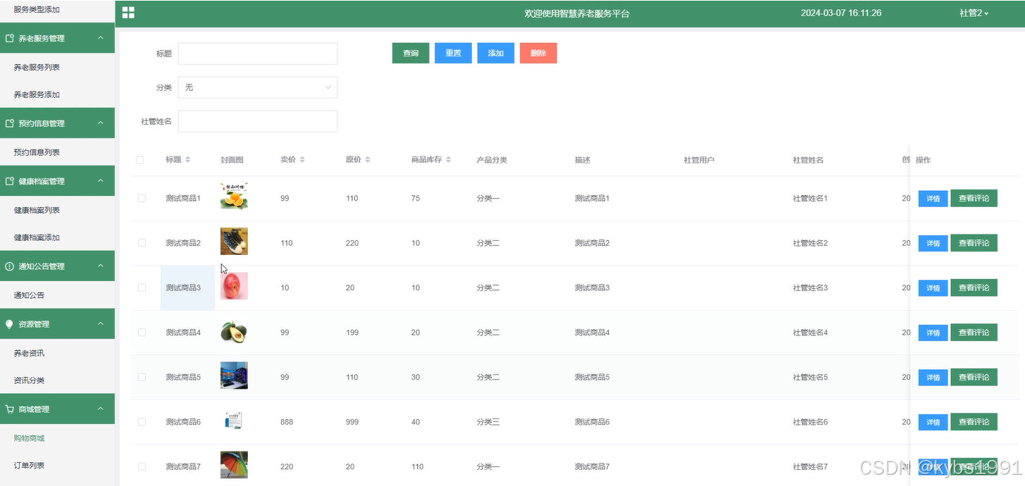 (4)商城管理:管理员可以对智慧养老服务平台中现有的商品进行增删改查。