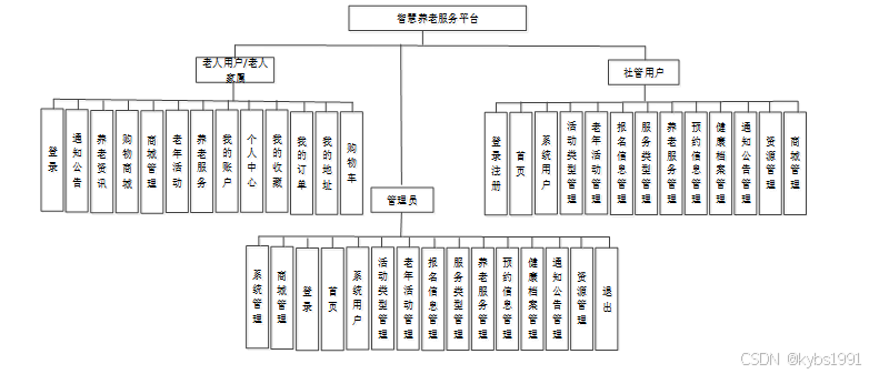 按照智慧养老服务平台的角色,我划分为了老人家属模块、老人用户模块、社管用户模块和管理员管理模块这四大部分。