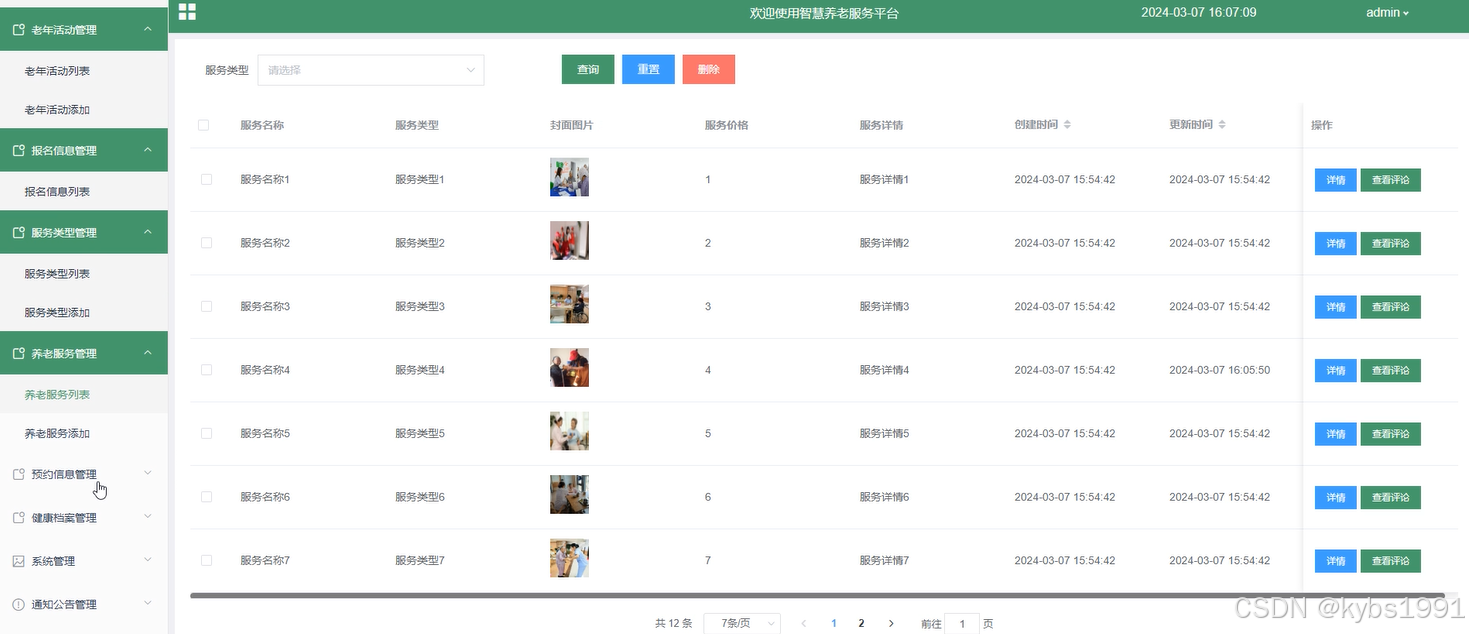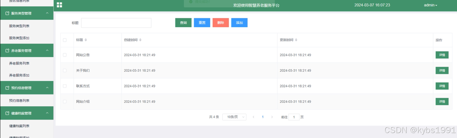 (9)养老服务:管理员点击“养老服务”会显示出所有的养老服务,支持输入服务名称或许服务类型对养老服务进行查询,如果想要添加新的养老服务,点击“添加”按钮,输入相关信息,点击“提交”按钮就可以添加了,同时可以选择某一条养老服务,点击“删除”进行删除,也可以对用户提交的养老服务评论的信息进行管控;