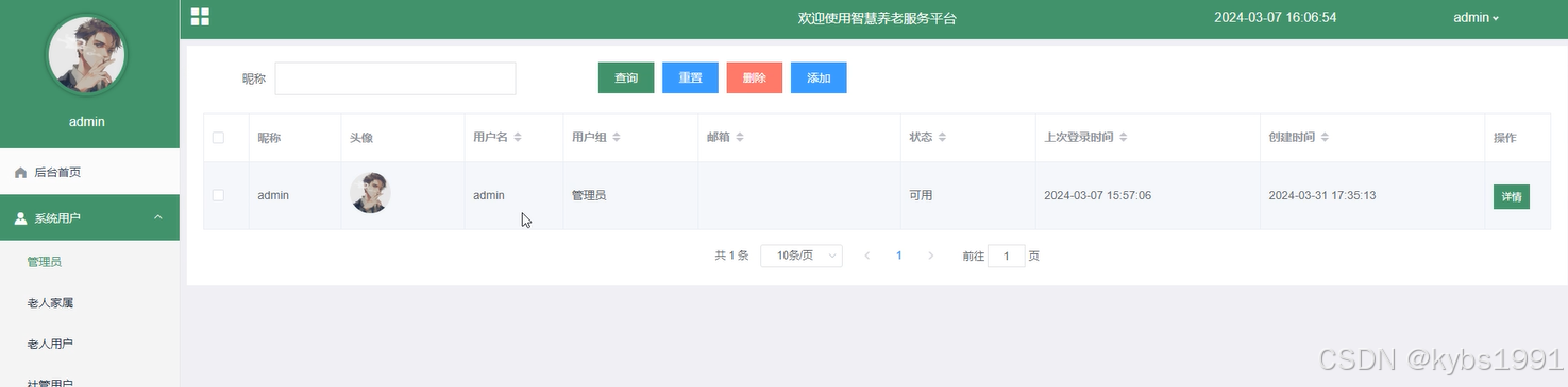 (4)系统用户:管理员点击“系统用户”菜单可以对系统中存在的用户进行管理,包含了管理员用户、老人用户、老人家属和社管用户。