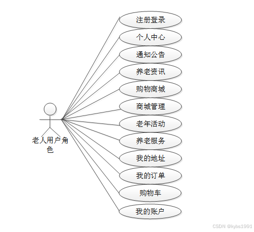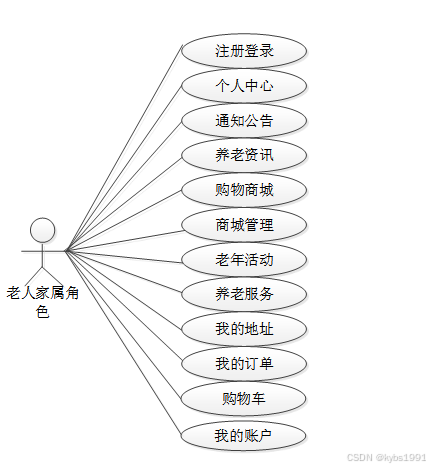 通过2.3功能的分析,得出了本智慧养老服务平台的用例图: