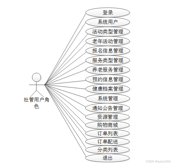 web后台管理上的社管用户是维护整个智慧养老服务平台中所有数据信息的。社管用户角色用例如图2-5所示。