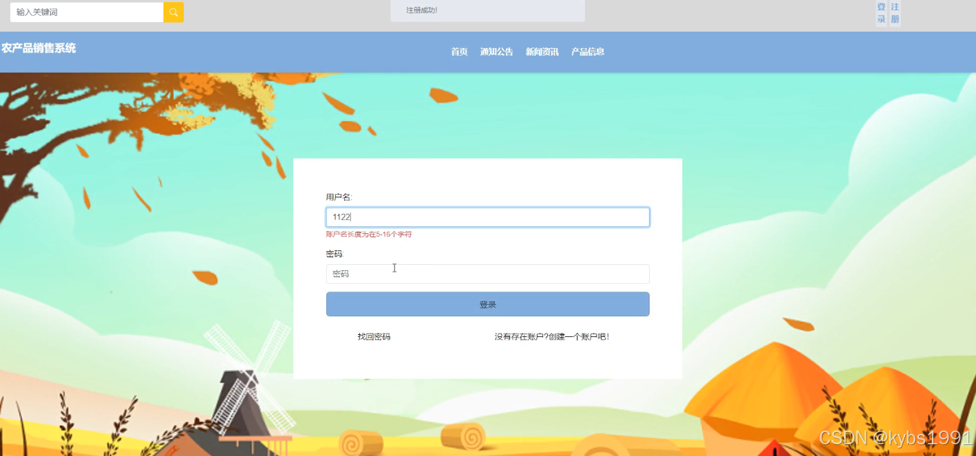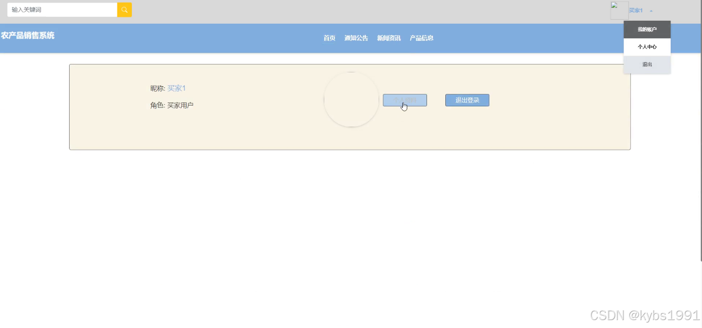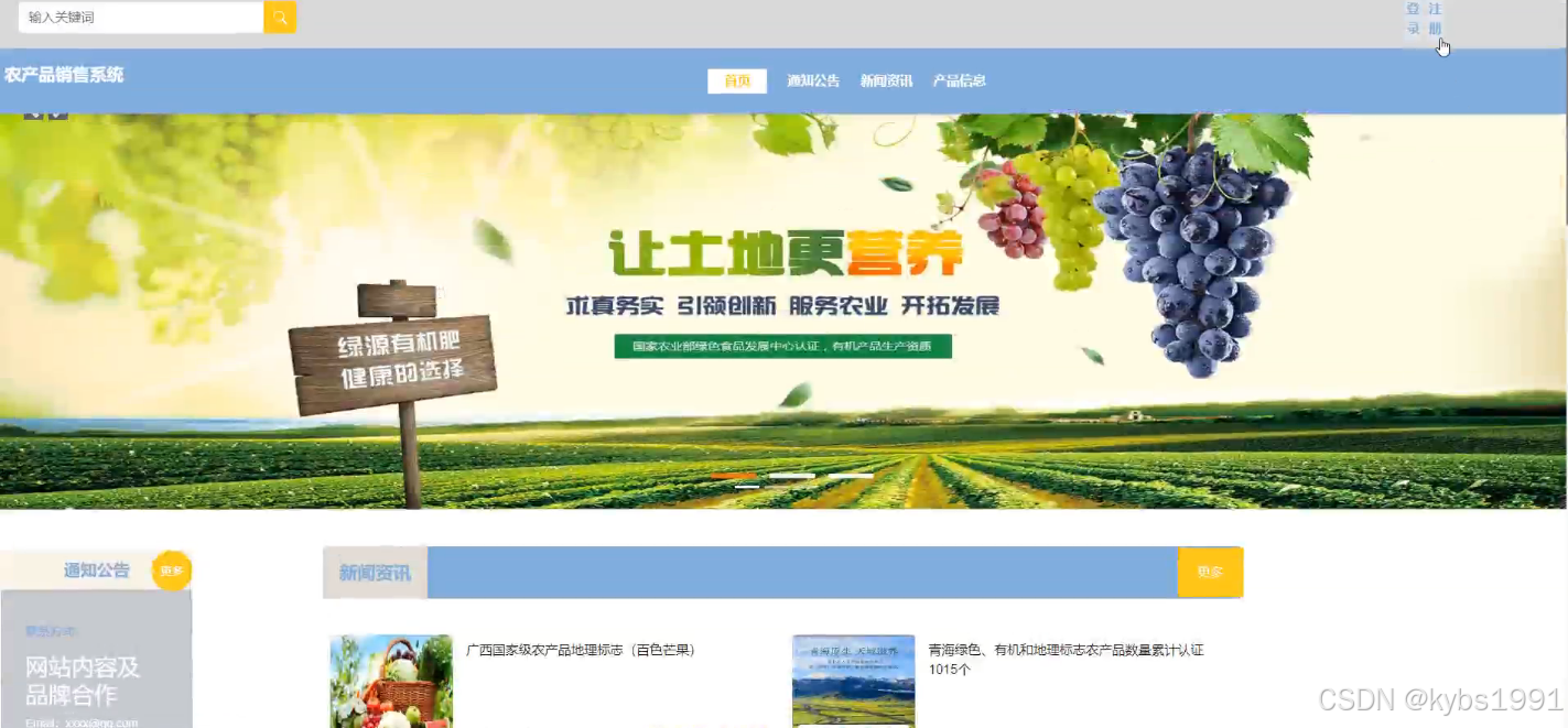 (2)首页:农产品销售系统的首页信息包含了首页、通知公告、新闻资讯、产品信息、我的账户、个人中心等。