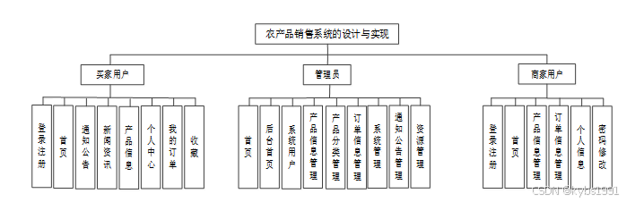 按照农产品销售系统的角色,我划分为了买家用户、商家用户、和管理员管理模块这三大部分。