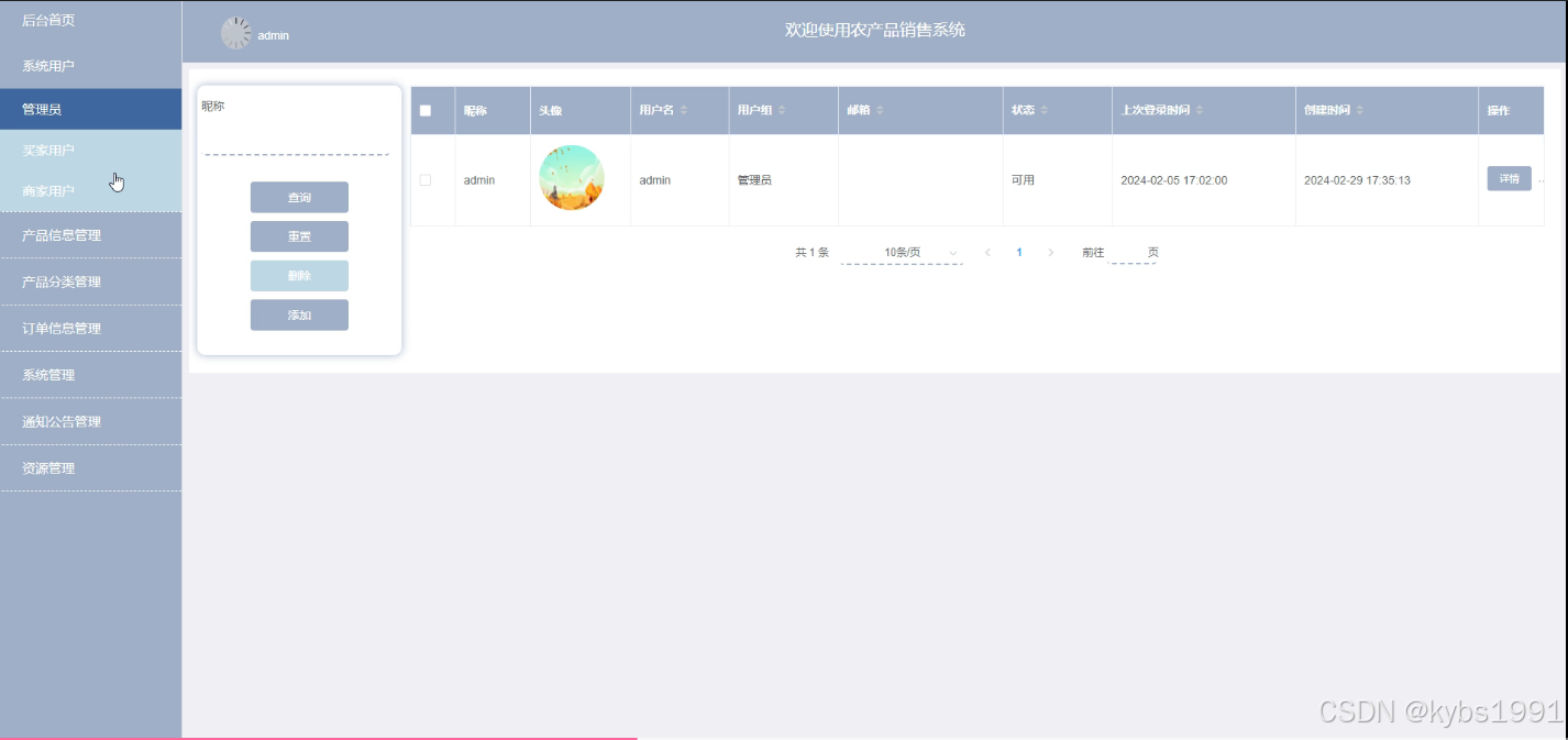 农产品销售系统中的管理人员是可以对前台注册的用户进行管理的,也可以对管理员进行管控。界面如下图4-7所示。