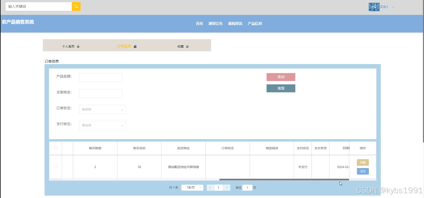 (5)产品信息:用户可以查看产品信息,在查询到自己想要了解的农产品信息的时候,可以进入查看详细的介绍包括产品名称、产品分类、产品价格等信息。买家用户点击“购买”这一按钮以后会跳转到物品购买填写的界面,根据提示填写好购买的信息,点击“提交”以后购买就完成了,在产品信息详情这个界面,支持所有前台用户对喜欢的产品信息进行点赞、收藏和评论的功能。