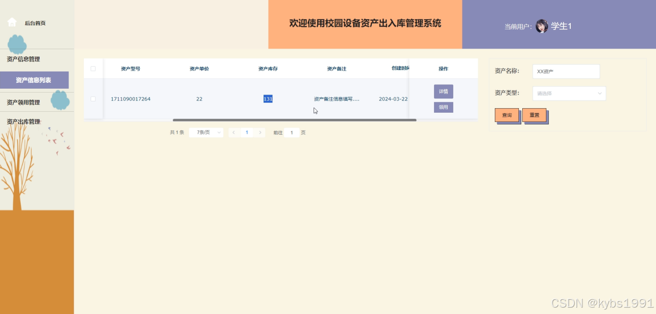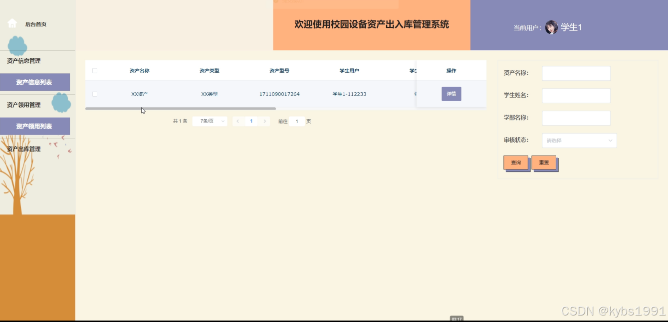 - 资产领用管理:用户在些页面可以看所有的资产领用信息,如资产名称、学生姓名、学部名称、审核状态等功能操作。