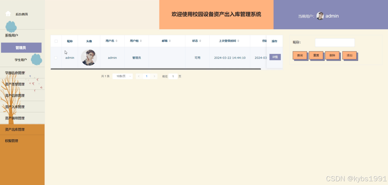 - 资产出库管理:管理员可以对所有的资产出库列表进行维护管理,并支持增删改查的操作。