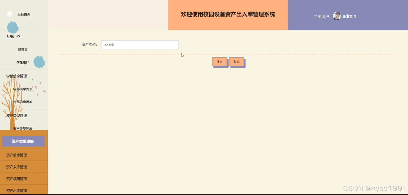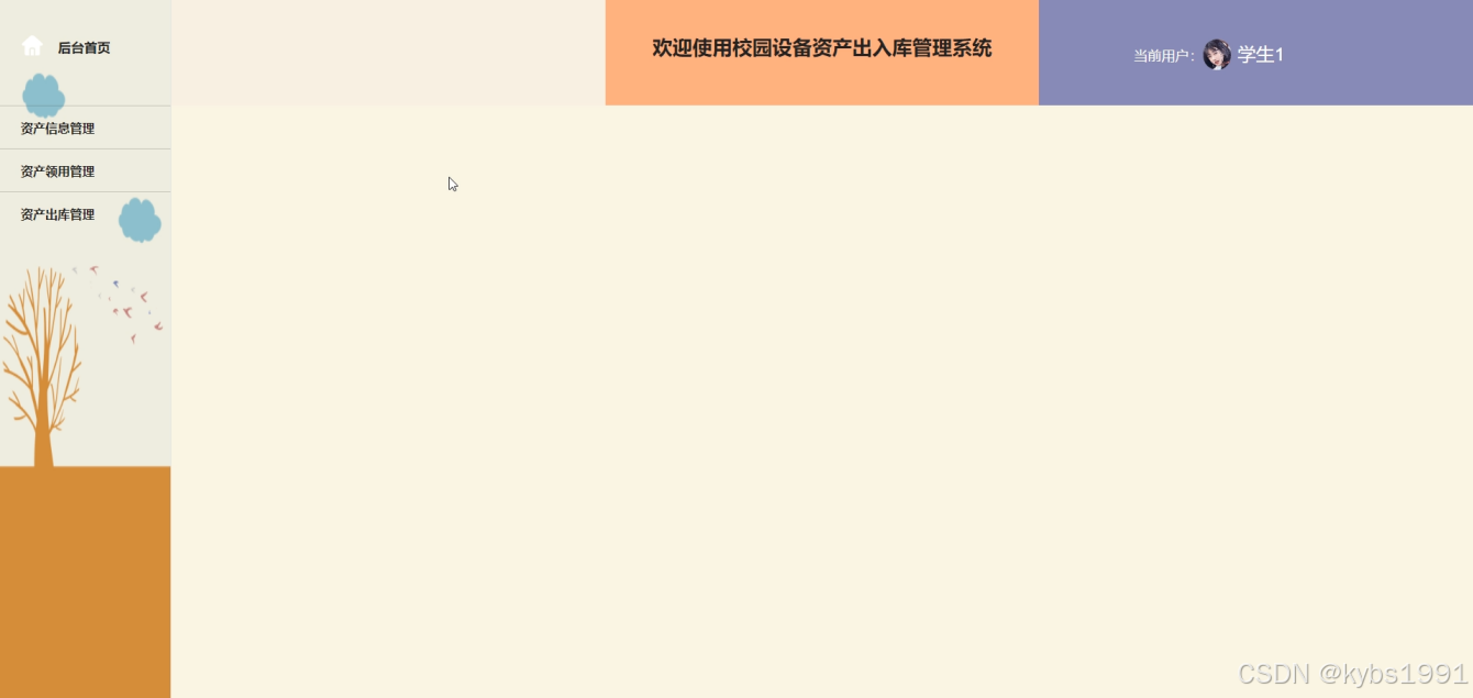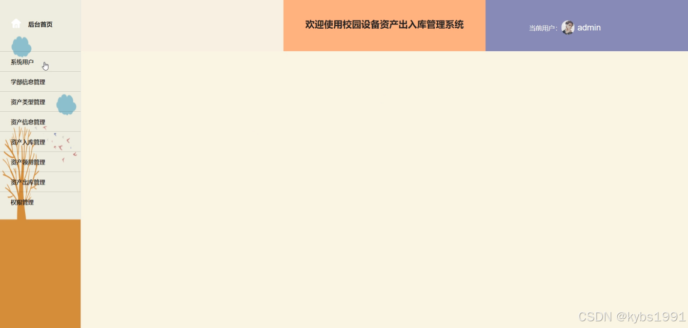 - 后台首页:用户在此页面可以看到系统用户、学部信息管理、资产信息管理、资产类型管理、资产入库管理、资产领用管理、资产出库管理、权限管理等功能操作。