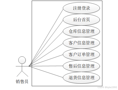 (2)销售员:后台首页、仓库信息管理、客户信息管理、客户订单管理、售后服务、售后信息管理、退货信息管理等功能。用户用例图如图3-3所示。