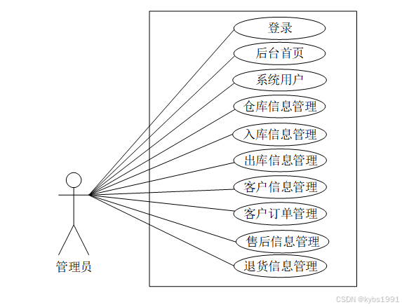 (1)管理员模块:系统中的核心用户是系统管理员,管理员登录后,通过管理员菜单来管理后台系统。主要功能有:首页、系统用户、仓库信息管理、入库信息管理、出库信息管理、客户信息管理、客户订单管理、售后信息管理、退货信息管理等功能。管理员用例图如图3-1所示。