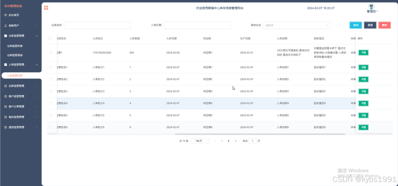 入库信息管理,管理员查看入库信息列表中的详情内容审核状态等、管理员列表中的某一条详情进行信息填写审核并提交,并可根据需求进行查询、重置、删除等操作。如图5-6所示。