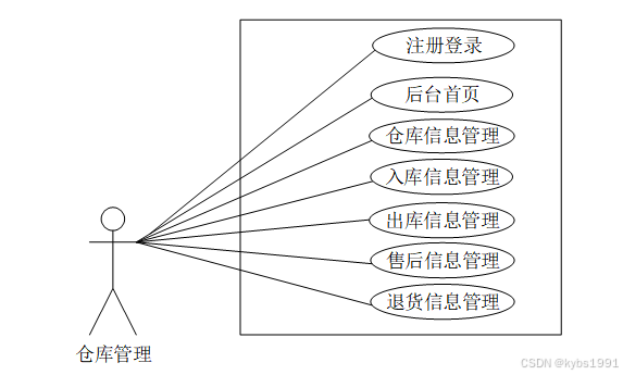 (2)仓库管理:后台首页、仓库信息管理、入库信息管理、出库信息管理、售后信息管理、退货信息管理等功能。用户用例图如图3-2所示。