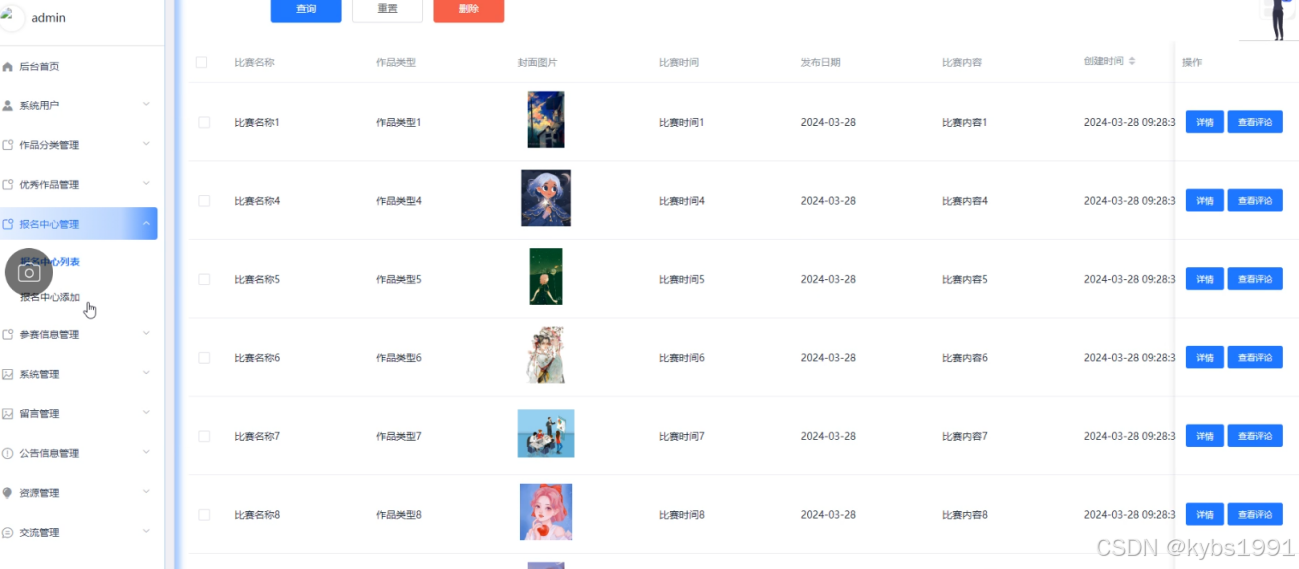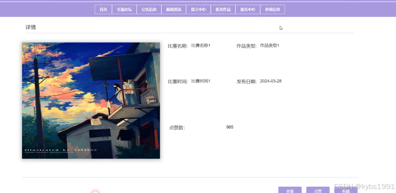 - 报名中心:用户可以查看系统上的各类绘画比赛的列表信息详情,可以进行点赞收藏和评论操作,也可以直接进行参赛操作。