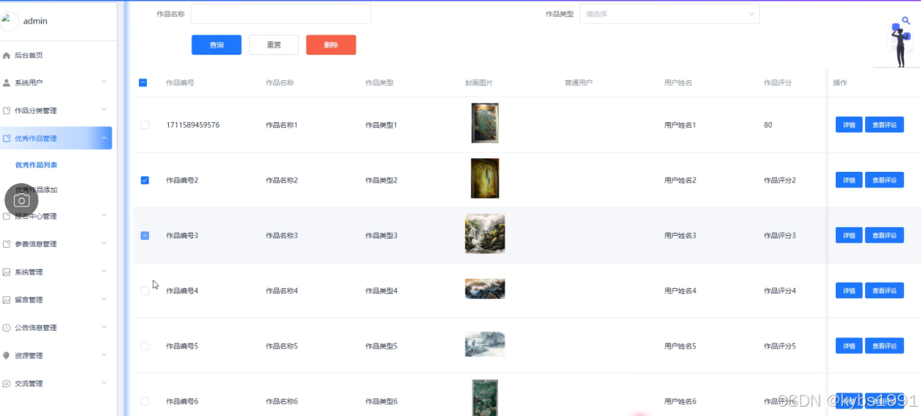 - 优秀作品管理:管理员可以对优秀作品列表信息进行查看,也可以添加新的优秀作品信息。