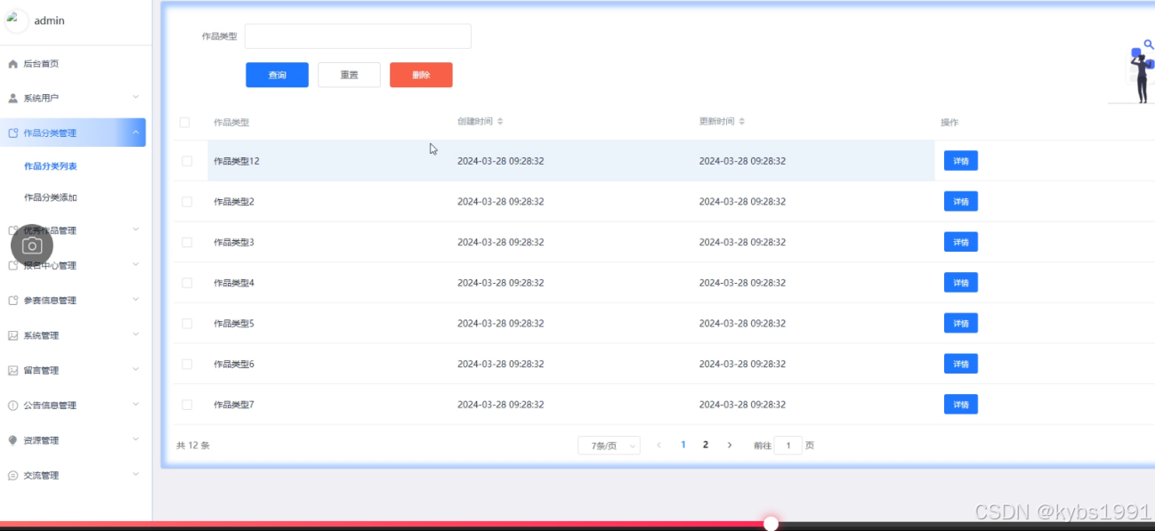 - 作品分类各类:管理员可以对作品分类列表信息进行查看,也可以添加新的作品分类信息。