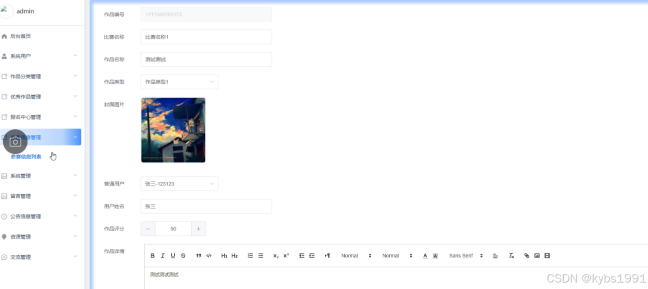 - 参赛信息管理:考核员可以对用户的参赛信息进行查看,并且对参赛作品进行评分处理以及对信息及逆行审核。