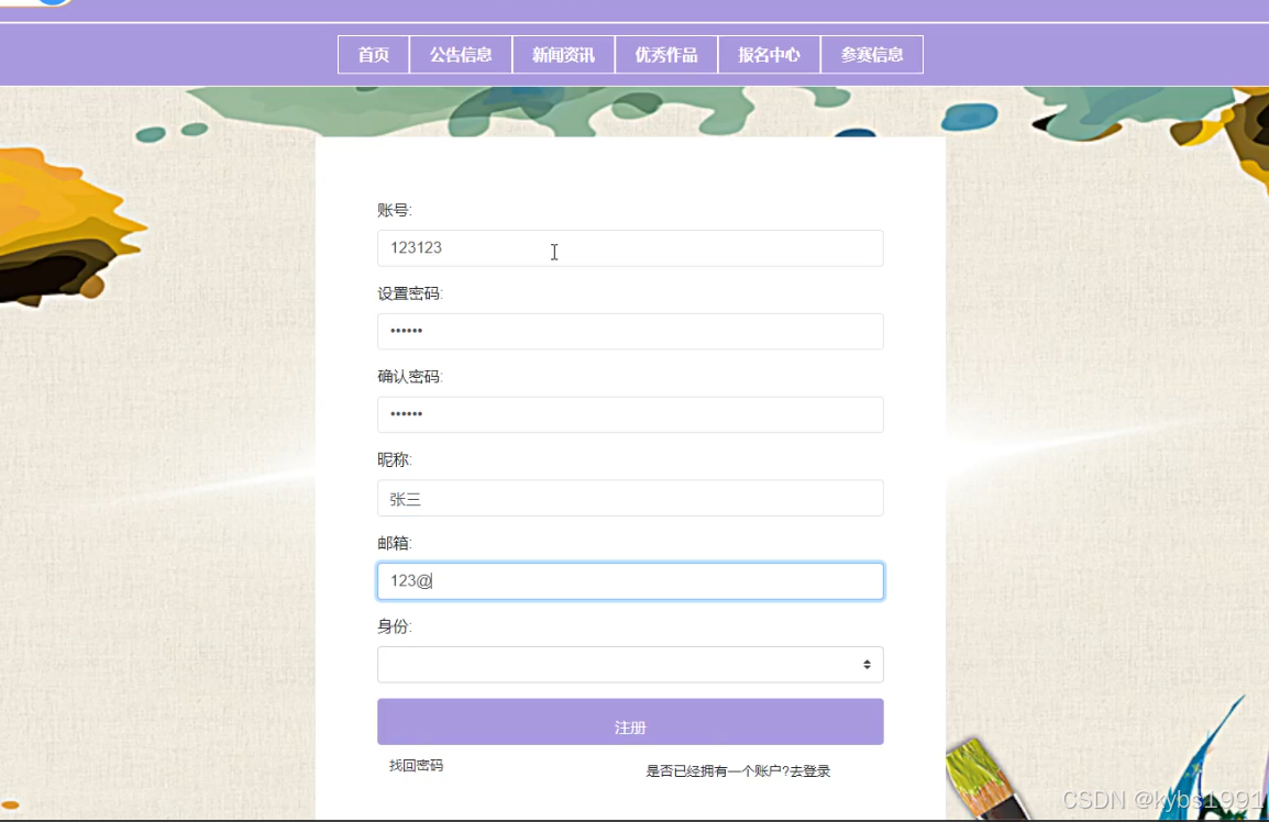 (1)注册登录:普通用户注册并登录SSM 绘画比赛管理系统;用户对个人信息的增删改查,比如个人资料,头像、密码修改。